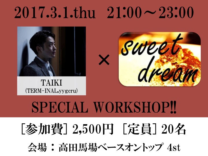 学生時代から頭角を表し、日本代表として世界大会にも出場、第一線で自らの踊りに磨きをかけ続けるTAIKI(TERM-INAL,yygcru)によるSPECIAL WORKSHOP!当日の内容はすべて主催者側でメモを取り、使用した楽曲についてもアーティスト名と曲名を後日配信。楽しいだけではなく確実に身になる、為になるWSを目指しています! 『TAIKI(TERM-INAL)×sweet dream』SPECIAL WORKSHOP!! ■日時 3月1日(木) 21:00~23:00 ※WSは21:15~22:45を予定、前後15分は着替え・準備時間となります ※終了後は21時まで会場を解放しておりますので、ご自由にご活用ください ■場所 高田馬場ベースオントップ 4st ※直接会場集合となります ■参加資格 ・男女性別は問いません ・時間、マナーの守れる方 ・中学生以下の方は保護者様の同伴が必須となります ■受講料 2,500円 ※当日キャンセルは料金の100%をご請求いたします ■WS内容 ・ベーシック ・グルーヴ ・フットワーク(振付) バランスよく要素をトレーニングします! ■参加者へのメッセージ ハウスダンスは映像では解らないことが多いですのでそういったトリビア的発見を見つけに来てください♪ ■講師経歴 TAIKI ( TERM-INAL,yygcru) 2000年代、TVプロダクトのHiphopから影響を受ける。その後上京し、クラブダンスやストリートダンスから数多くを学ぶ。 現在はハウスダンスチーム「TERM-INAL」のリーダー。先人の学びを得て独自のステップワークへと構築しはじめ、Juste Debout、Tokyo Dance Delight、Dance Alive等 世界大会で高い評価を獲得。実験と創造精神を大切に日々踊っている。ハウスダンスパーティ「Discovery」を主宰 ■注意事項 ・定員は先着順20名となります ・参加費は開始前に回収致します ・室内履きをお持ちください ・参加者は開始時間までに会場へお越しいただき、遅れる際はご連絡をお願い致します。 ・当日の内容はすべて主催者側でメモを取り、使用した楽曲についてもアーティスト名と曲名を後日配信致します